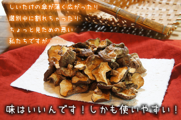しいたけの傘が開ききってソリ返り、 肉が薄いものや、 乾燥した時の焼き色が悪かったり、 収穫の時にちぎれたりなどなど・・・・味は変わりませんが見た目が悪いというだけの理由で出荷出来ない不定期に出てくるしいたけ達。
